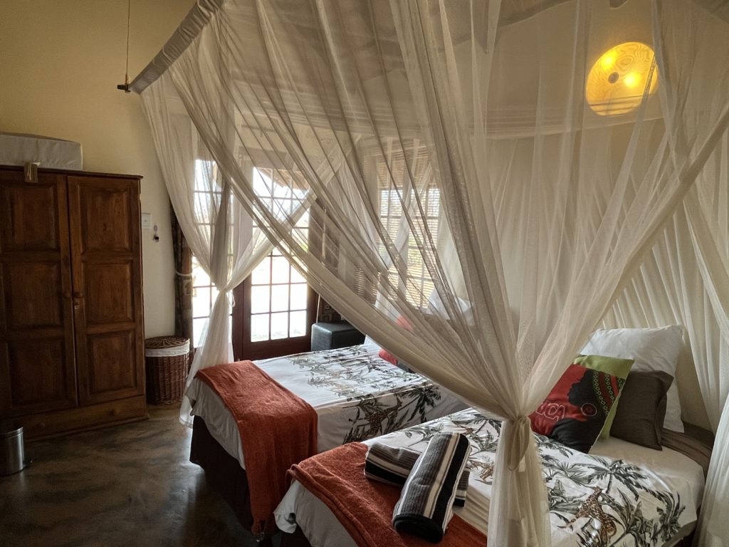 Dit is een wat kleinere slaapkamer met twee enkele bedden. De deuren geven toegang tot een semi-privé terras met een lounge set met uitzicht op de bush, waterdam en het Krugerpark aan de horizon.